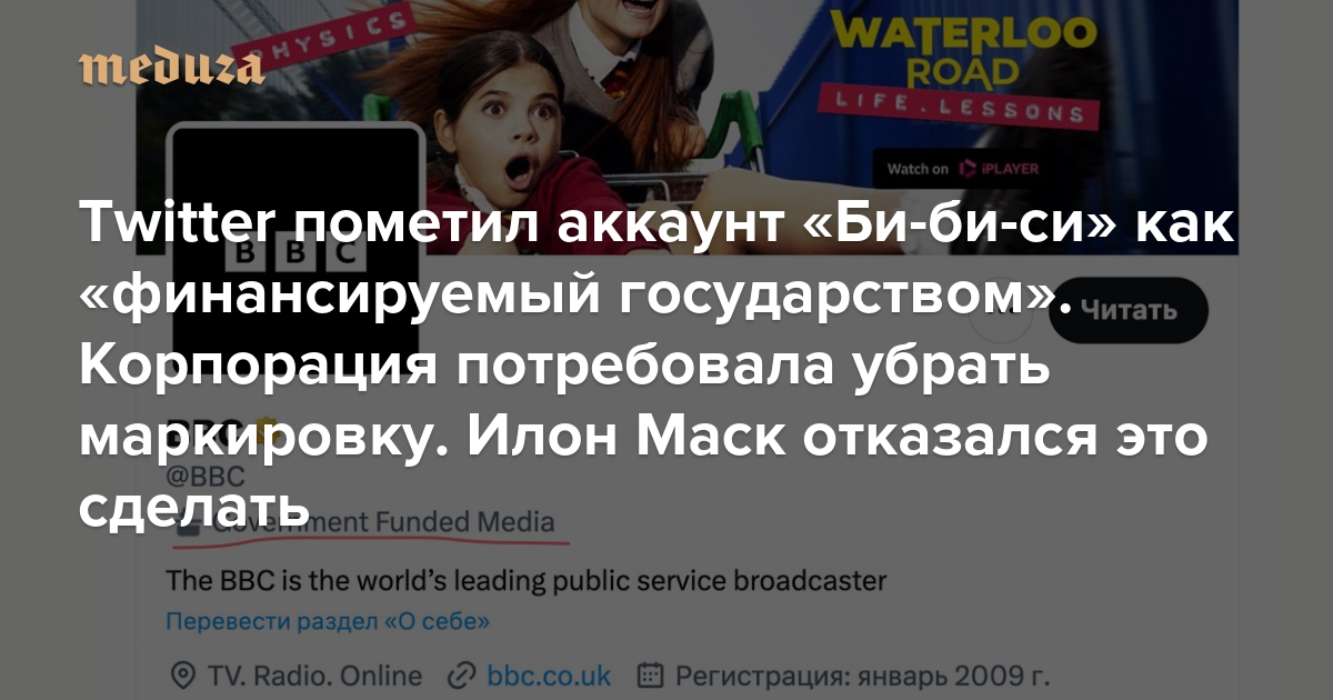 Twitter пометил аккаунт «Би-би-си» как «финансируемый государством». Корпорация потребовала убрать маркировку — но Илон Маск отказался это сделать