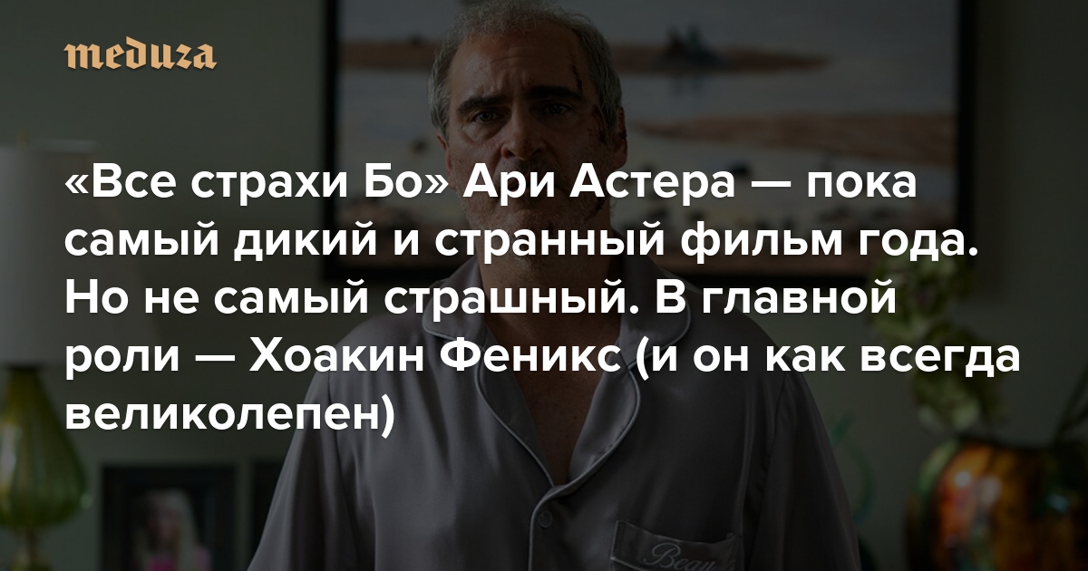 Режиссер Ари Астер, снявший новаторские хорроры «Реинкарнация» и «Солнцестояние», выпустил новую картину — «Все страхи Бо» (с 4 мая ее можно будет увидеть и в России). Поклонникам режиссера точно не стоит ждать чего-то похожего на предыдущие работы Астера — на этот раз сюжет гораздо более сложный, непредсказуемый и, неожиданно, совсем не страшный. Кинокритик «Медузы» Антон Долин посмотрел «Все страхи Бо» и рассказывает, почему — помимо очередной великолепной роли Хоакина Феникса — его стоит увидеть.