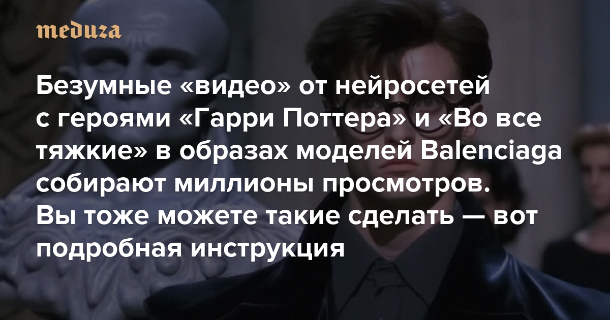 Безумные «видео» от нейросетей с героями «Гарри Поттера» и «Во все тяжкие» в образах моделей с показов Balenciaga собирают миллионы просмотров Вы тоже можете сделать такие — с любыми персонажами и брендами. Вот подробная инструкция