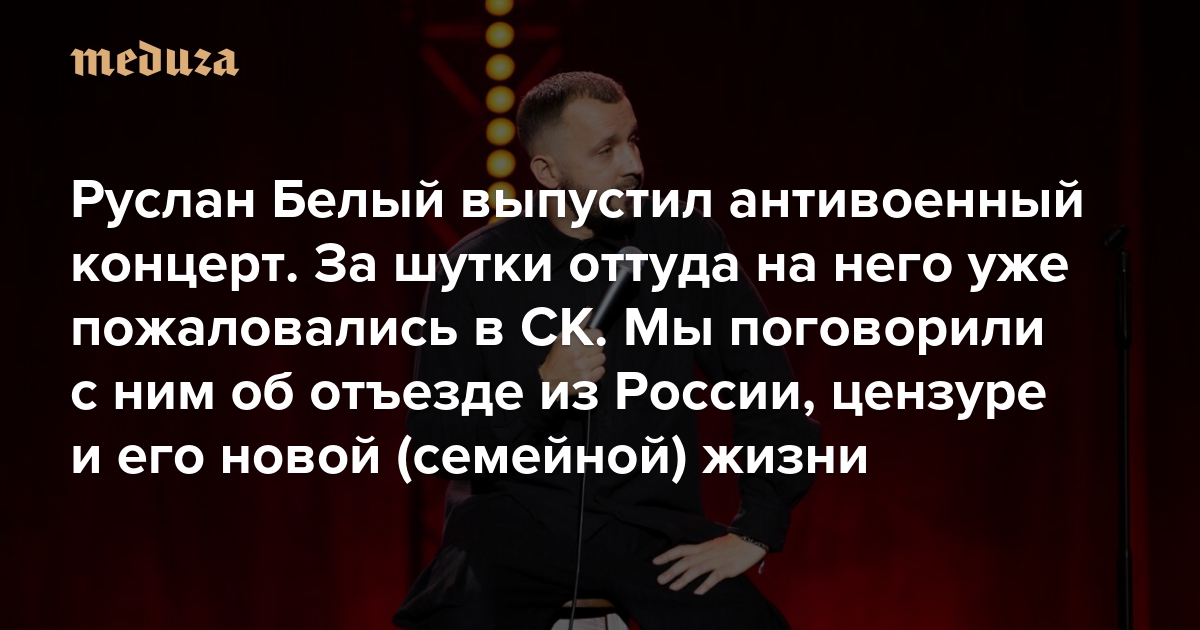 Общественное движение «Ветераны России» в марте 2023 года пожаловалось на комика Руслана Белого в Следственный комитет России — в своем обращении организация попросила проверить его на предмет «дискредитации армии» и «публичные призывы к экстремизму». В то же время воронежское отделение ЛДПР потребовало проверить на экстремизм видео выступления Белого, в котором он говорит, что «между глаголами „нападать“ и „защищать“ он бы выбрал „защищать“». Это реплика из его последнего концерта «Все еще» — он был записан в Москве в декабре 2022 года, недавно его опубликовали на онлайн-платформе Белого Concert Place. «Медуза» поговорила с Белым о том, почему для него было принципиально важно записать антивоенный концерт в России и как изменилась его жизнь после отъезда из страны и женитьбы.