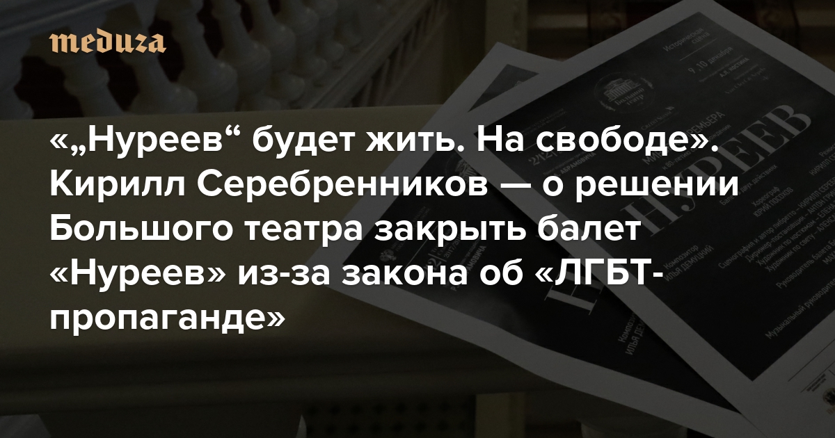 Режиссер Кирилл Серебренников в серии постов в телеграме прокомментировал решение Большого театра убрать из репертуара балет «Нуреев» о великом танцовщике Рудольфе Нурееве, который в 1961 году не вернулся в СССР с зарубежных гастролей. Директор театра Владимир Урин объяснял, что постановку отменили из-за закона, «где абсолютно однозначно обговорены вопросы, связанные с вопросами пропаганды нетрадиционных ценностей». Кирилл Серебренников считает, что «силовики от культуры» закрыли балет, чтобы показать обществу готовность применять «очередной антиЛГБТ+ закон». «Медуза» публикует заявление Серебренникова.