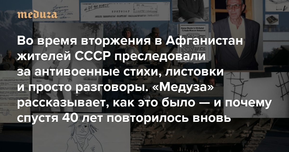 «Нормальный человек не может выступать против войны» Во время вторжения в Афганистан жителей СССР преследовали за антивоенные стихи, листовки и просто разговоры. «Медуза» рассказывает, как это было — и почему спустя 40 лет повторилось вновь