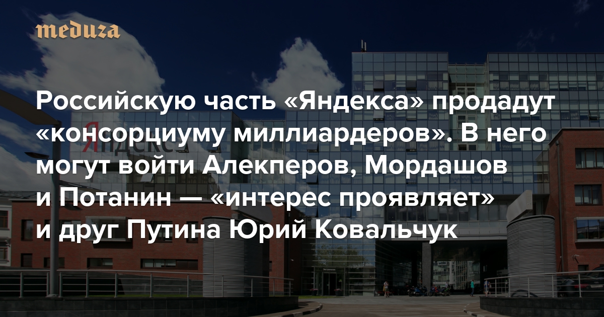 Российскую часть «Яндекса» продадут «консорциуму миллиардеров». В него могут войти Алекперов, Мордашов и Потанин — «интерес проявляет» и друг Путина Юрий Ковальчук Мы узнали, как Кремль и Кудрин готовят эту сделку