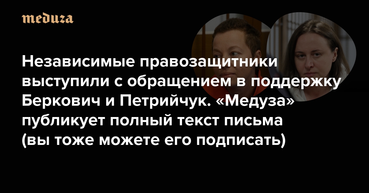 «Спектакль — это не социологический трактат» Независимые правозащитники выступили с обращением в поддержку Беркович и Петрийчук. «Медуза» публикует полный текст письма (вы тоже можете его подписать)