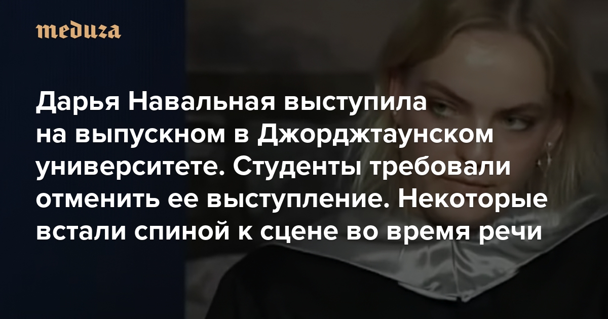 Дочь российского оппозиционера и политического заключенного Алексея Навального Дарья выступила на церемонии вручения дипломов в Школе дипломатической службы Джорджтаунского университета США. Запись выступления опубликовал ютьюб-канал «Навальный Live». Студенты, преподаватели и выпускники университета требовали отменить выступление Навальной из-за высказываний ее отца в прошлом, в том числе о российской аннексии Крыма в 2014 году. Судя по записи речи, некоторые студенты с флагами Украины повернулись спиной к сцене, когда на нее поднялась Навальная. Другие проводили ее аплодисментами. «Медуза» публикует расшифровку речи Дарьи Навальной с незначительными сокращениями.