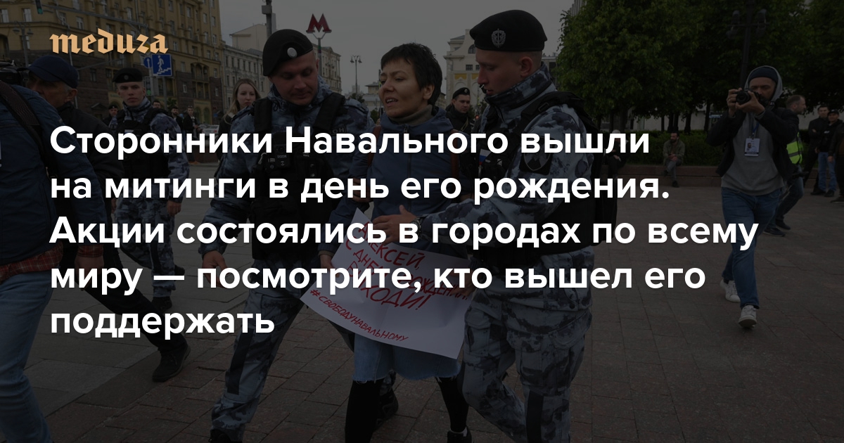 В день рождения Алексея Навального сторонники политика вышли на уличные акции. Их организовали по всему миру: в списке значится 120 городов, среди которых Женева, Буэнос-Айрес, Прага, Тель-Авив, Париж, Хельсинки, Торонто, Мехико, Стокгольм и многие другие. В некоторых городах — например, в Токио, Сиднее, Тбилиси и Вильнюсе — в митингах приняли участие десятки человек. В России же в основном выходят на одиночные пикеты и точечные акции — в Хабаровске, Красноярске, Ростове-на-Дону, Калининграде, Екатеринбурге, Омске, Саратове, Санкт-Петербурге и других городах. Риски митингующих в России высоки как никогда (для них «Медуза» подготовила подробную инструкцию), и нескольких человек уже задержали. Команда Навального обещает участникам акций юридическую поддержку, а также помощь в оплате штрафов. Тем, кто не готов митинговать, предлагается расклеивать листовки, писать посты в соцсетях, оставлять надписи на стенах и асфальте — правда, за все это тоже могут задержать. Например, в Красноярске местного жителя доставили в отделение полиции за надпись мелом на асфальте «Свободу политзаключенным». В Барнауле задержали женщину, которая «гуляла с воздушным шариком».