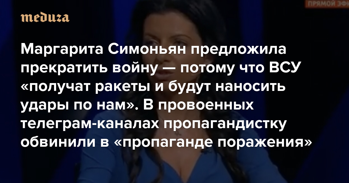Маргарита Симоньян предложила прекратить войну — потому что ВСУ «получат ракеты и будут наносить удары по нам» В провоенных телеграм-каналах пропагандистку обвинили в «пропаганде поражения»