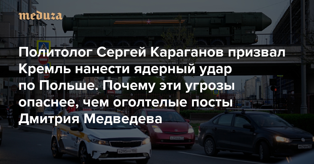 Политолог Сергей Караганов призвал Кремль нанести ядерный удар по Польше Спецкор «Медузы» Андрей Перцев объясняет, почему эти угрозы на самом деле опаснее, чем оголтелые посты Дмитрия Медведева