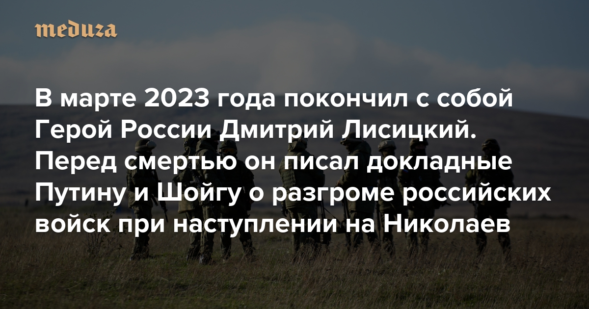В марте 2023 года покончил с собой Герой России Дмитрий Лисицкий. Перед смертью он писал докладные Путину и Шойгу о разгроме российских войск при наступлении на Николаев