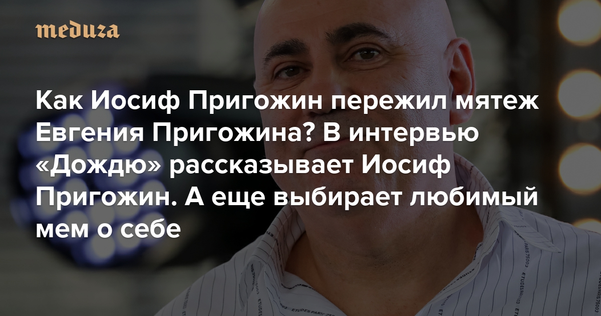 Музыкальный продюсер и муж певицы Валерии Иосиф Пригожин, которого часто (и в шутку, и всерьез) путают с его однофамильцем, главой ЧВК Вагнера Евгением Пригожиным, дал интервью телеканалу «Дождь». Он рассказал, как пережил мятеж наемников, и выбрал любимый мем о себе (при этом мемы о продюсере делали и до попытки переворота — на фоне войны с Украиной и слива беседы с миллиардером Фархадом Ахмедовым). «Медуза» пересказывает главные моменты разговора Иосифа Пригожина с журналистами «Дождя».