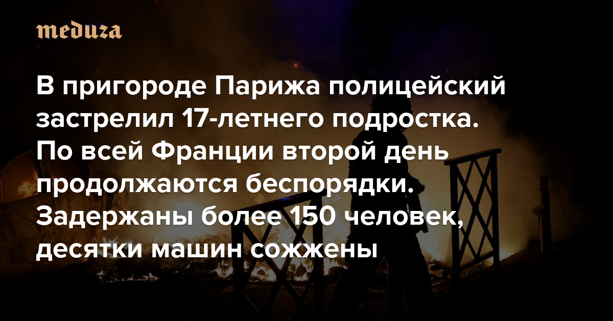 В пригороде Парижа полицейский застрелил 17-летнего подростка. По всей Франции второй день продолжаются беспорядки Задержаны более 150 человек, десятки машин сожжены