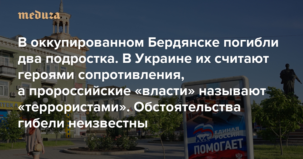 24 июня в оккупированном Бердянске погибли 16-летние местные жители Тигран Оганнисян и Никита Ханганов. За несколько месяцев до этого «власти» аннексированной РФ части Запорожской области преследовали подростков, считая их «проукраинскими террористами». В Украине подростков считают партизанами, которых за их взгляды пытали пророссийские силовики. Перед смертью один из них записал видео, которое заканчивается лозунгом «Слава Украине». Обстоятельства гибели подростков неизвестны, а их тела не возвращают родным. О деле «бердянских партизан» рассказала «Би-би-си» — публикации об этом выпустили русская и украинская службы корпорации. «Медуза» пересказала этот материал.
