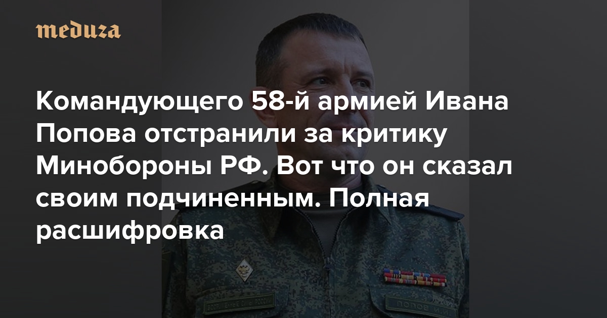 Командующего 58-й армией Ивана Попова отстранили за критику Минобороны РФ. Вот что он сказал своим подчиненным Полная расшифровка