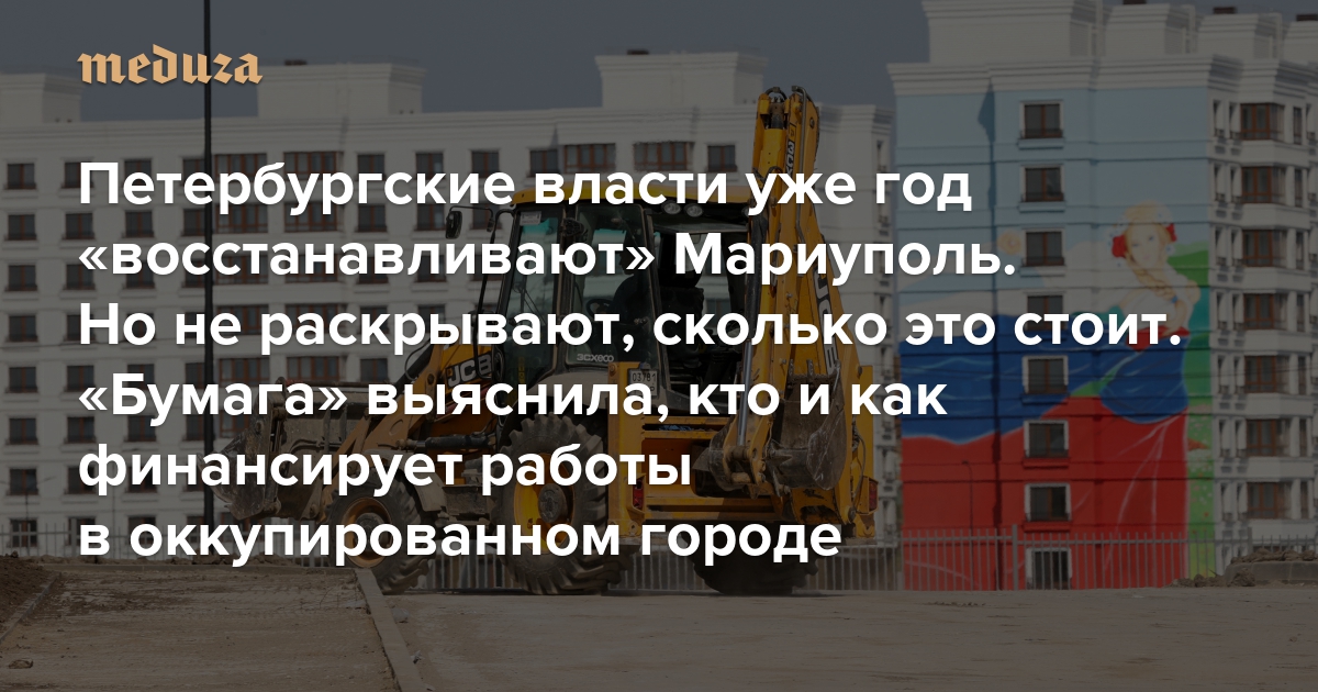 Больше года назад российские власти начали «восстанавливать» разрушенный и оккупированный ими Мариуполь. В этом активно участвует Санкт-Петербург — в мае 2022-го губернатор Александр Беглов объявил о побратимстве двух городов. Смольный часто отчитывается о помощи Мариуполю, о сданных жилых домах и школах, но сколько это стоит и кто этим занимается — никогда не раскрывает. Издание «Бумага» изучило финансовую отчетность властей и компаний и выяснило, что в работах в Мариуполе и их финансировании участвует не менее 25 петербургских организаций. С разрешения издания «Медуза» публикует этот текст полностью.