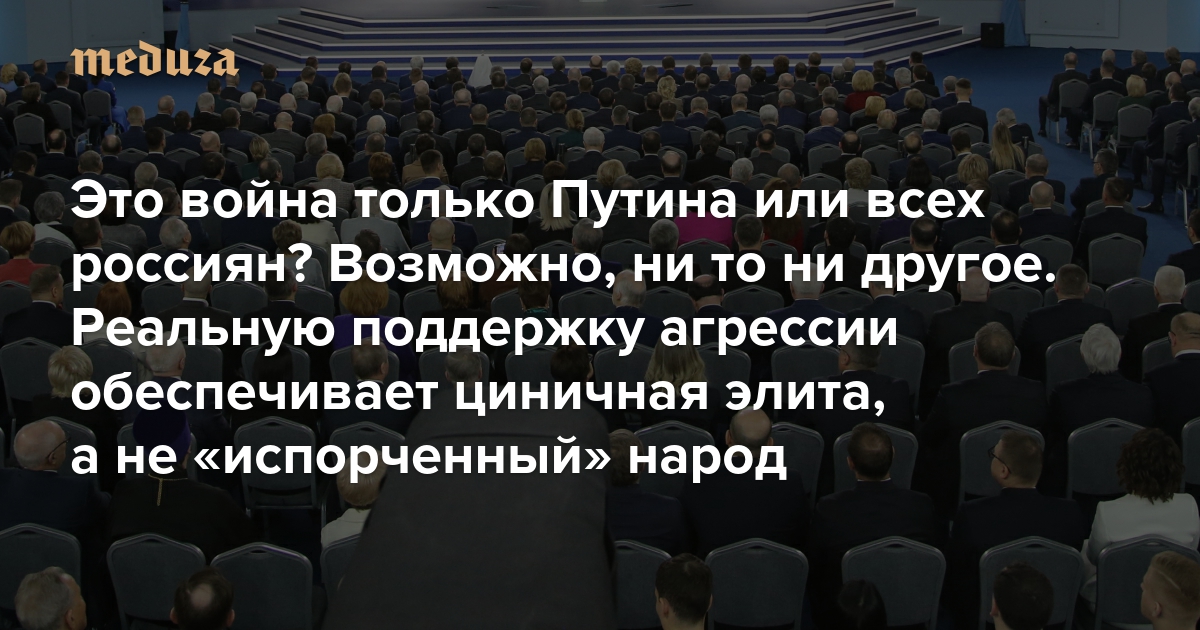 Это война только Путина или всех россиян? Возможно, ни то ни другое Еще одна социологическая гипотеза состоит в том, что реальную поддержку агрессии обеспечивает циничная элита, а не «испорченный» народ