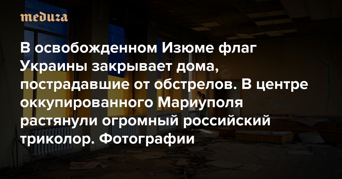 В освобожденном Изюме флаг Украины закрывает дома, пострадавшие от обстрелов. В оккупированном Мариуполе огромный российский триколор растянули на центральной площади Пятьсот сорок пятый день войны. Фотографии