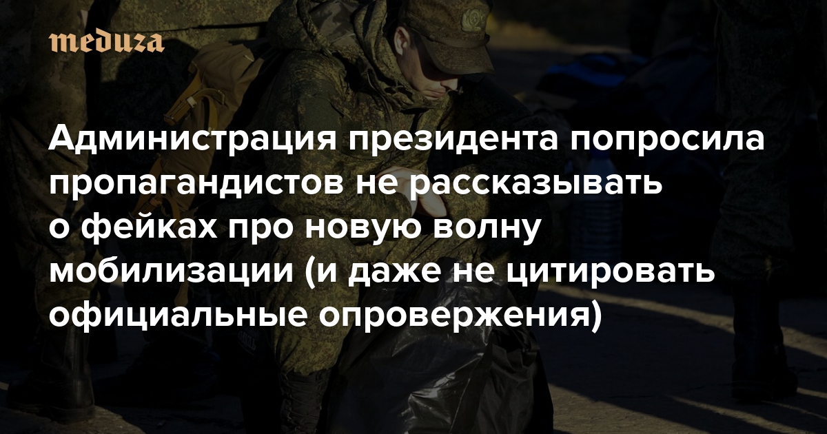 «Как можно меньше говорить об этой теме» Администрация президента попросила пропагандистов не рассказывать о фейках про новую волну мобилизации (и даже не цитировать официальные опровержения)