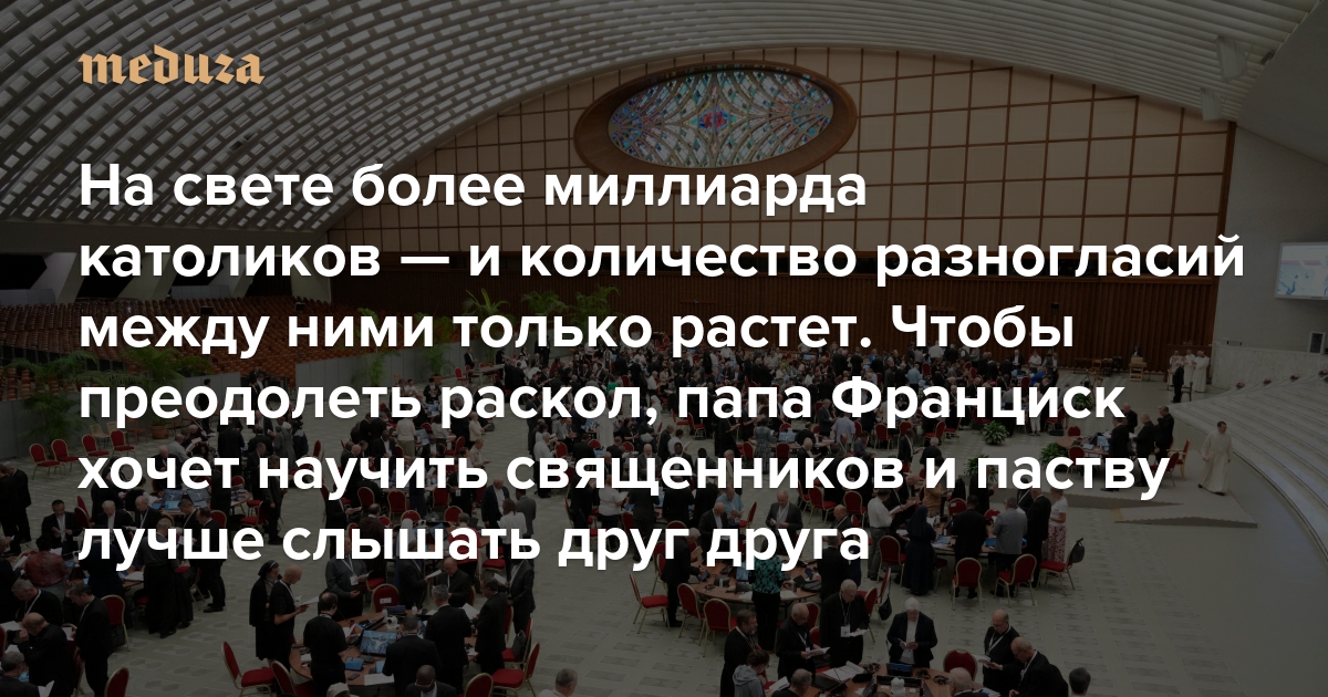 На свете более миллиарда католиков — и количество разногласий между ними только растет. Чтобы преодолеть раскол, папа Франциск хочет научить священников и паству лучше слышать друг друга Но не все согласны с революционными идеями понтифика