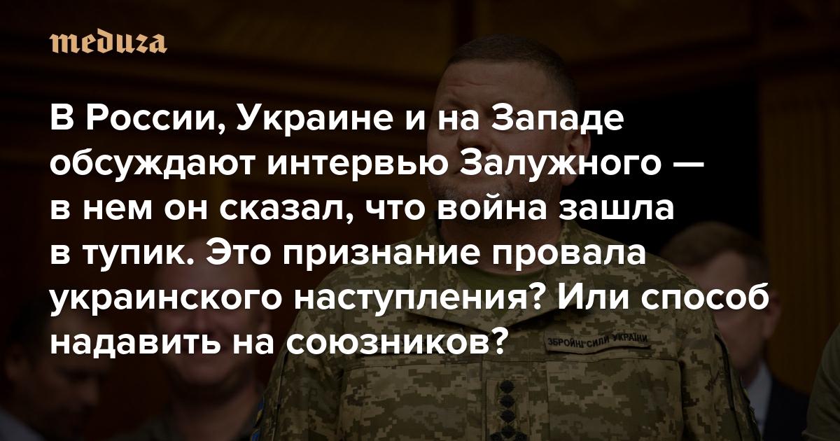 В журнале The Economist 1 ноября вышло интервью главкома ВСУ Валерия Залужного, в котором он, в частности, выразил мнение, что война с Россией «зашла в тупик». Об этом интервью много писала российская пропаганда — она делала акцент на том, что украинское контрнаступление не достигло заявленных целей. В самой Украине и на Западе многие полагают, что Залужный дал интервью, по большей части, с целью оказать давление на западных союзников, чтобы они увеличили масштабы военной помощи Украине. «Медуза» рассказывает о реакции, которую его слова вызвали в Украине, России и на Западе.