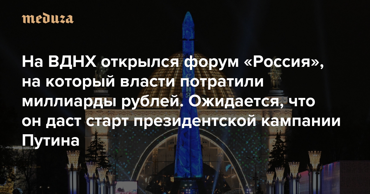 На ВДНХ открылся форум «Россия», на который власти потратили миллиарды рублей. Ожидается, что он даст старт президентской кампании Путина А пока гости наслаждаются пением Шамана, стендами аннексированных регионов и рассуждениями Пескова о двойниках президента