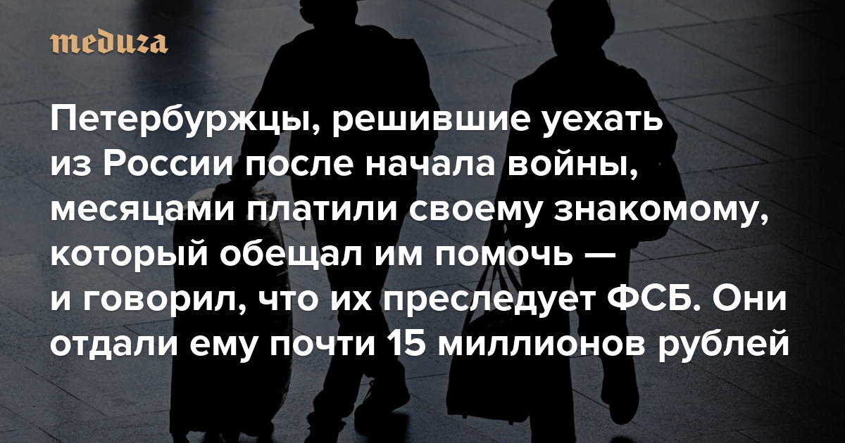 Петербуржцы, решившие уехать из России после начала войны, месяцами платили своему знакомому, который обещал им помочь — и говорил, что их преследует ФСБ Они отдали ему почти 15 миллионов рублей, рассказала «Медиазона»