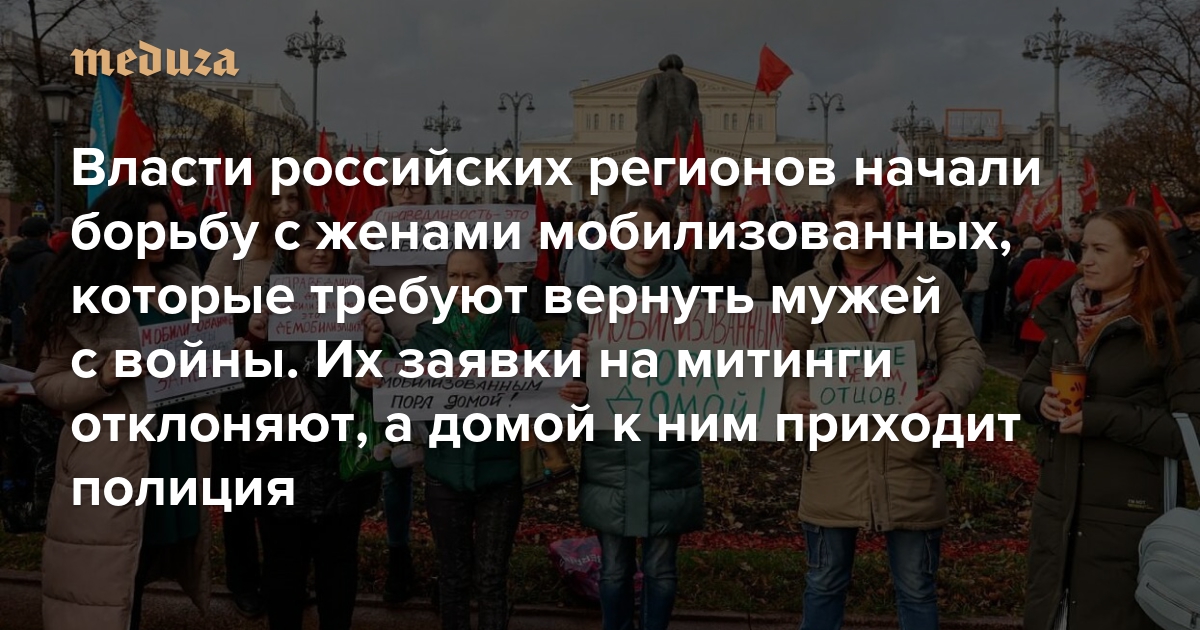 За последние недели в ряде регионов России власти отказали в проведении митингов женам мобилизованных, которые требуют вернуть их мужей с войны. Как минимум в двух регионах — Кемеровской области и Красноярском крае — домой к женщинам, состоящим в чатах, где обсуждаются такие акции, приходили полицейские.