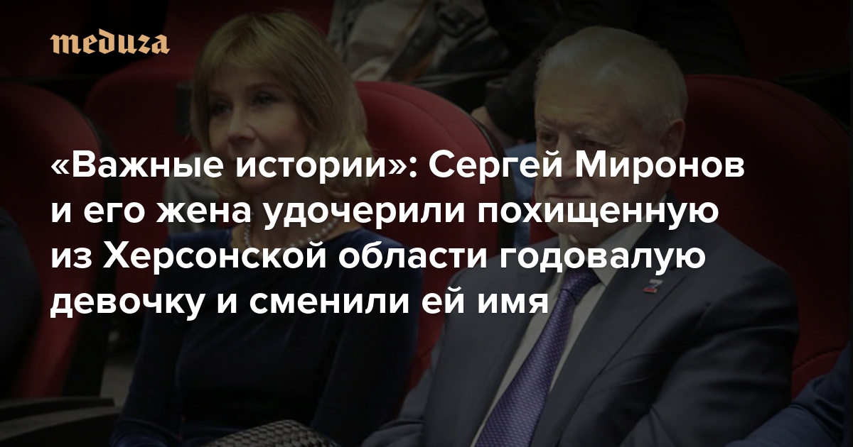 Лидер партии «Справедливая Россия» Сергей Миронов и его жена Инна Варламова удочерили вывезенную из Херсонской области годовалую девочку и сменили ей имя. Об этом говорится в расследовании «Важных историй» и студии документальных фильмов Top Hat/Hayloft Productions. Издание отмечает, что это «первый документально доказанный случай усыновления украинского ребенка российским политиком такого ранга».