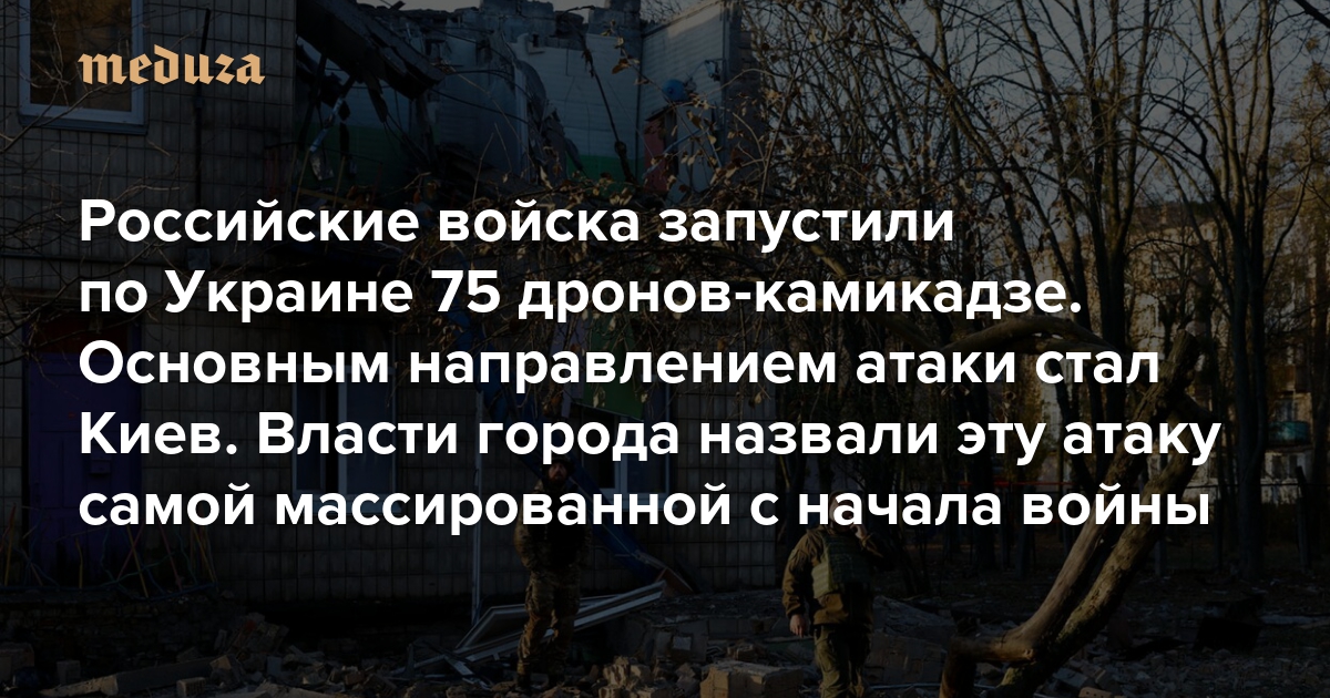 Российские войска запустили по Украине 75 дронов-камикадзе. Основным направлением атаки стал Киев Власти города назвали эту атаку самой массированной с начала войны. Пострадали пять человек