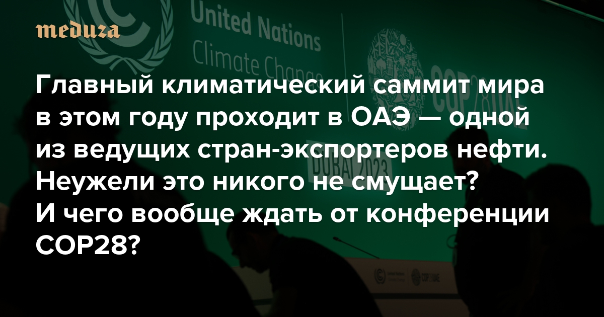 Саммит COP28 — самое важное климатическое мероприятие 2023 года, проводимое под эгидой ООН, — открылся 30 ноября в Дубае и продлится еще две недели. Неоднозначный выбор места проведения конференции уже спровоцировал ряд скандалов. Помимо того, что Объединенные Арабские Эмираты (ОАЭ), как один из крупнейших мировых экспортеров нефти, в принципе едва ли заинтересованы в зеленой повестке, журналисты еще и заподозрили местные власти в желании продавить интересы сырьевых компаний на правах страны-хозяйки прямо на полях саммита. Но в то же время ОАЭ важны в борьбе с глобальным изменением климата как источник ресурсов для решения самого больного вопроса — недостатка денег на реализацию экологических инициатив. «Медуза» рассказывает, почему главную климатическую конференцию года все же доверили провести нефтеносной монархии, какую пользу приносит миру COP и чего стоит ждать от мероприятия в 2023 году.