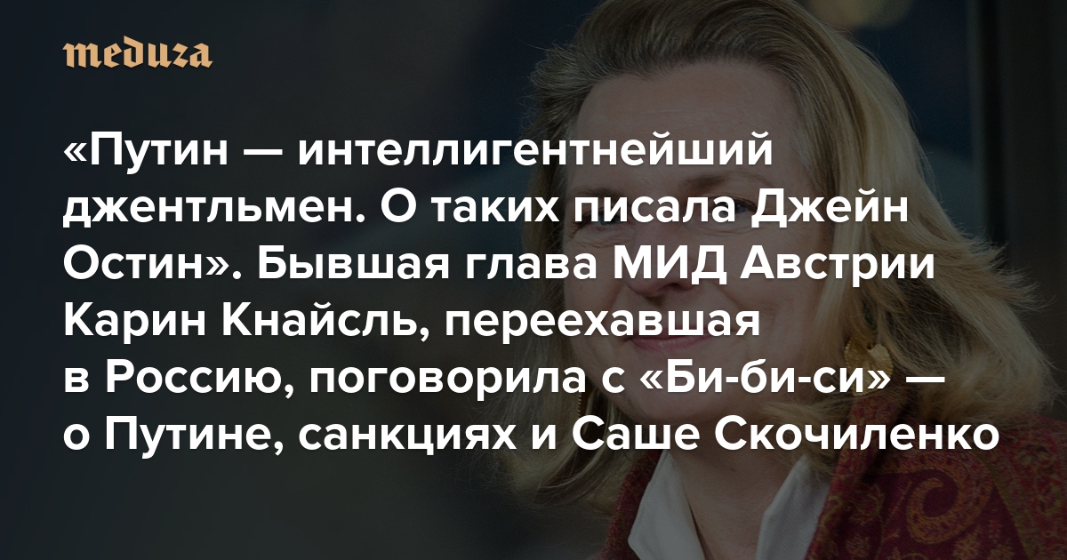 «Путин — интеллигентнейший джентльмен. О таких писала Джейн Остин» Бывшая глава МИД Австрии Карин Кнайсль, переехавшая в Россию, поговорила с «Би-би-си» — о Путине, санкциях и деле Саши Скочиленко