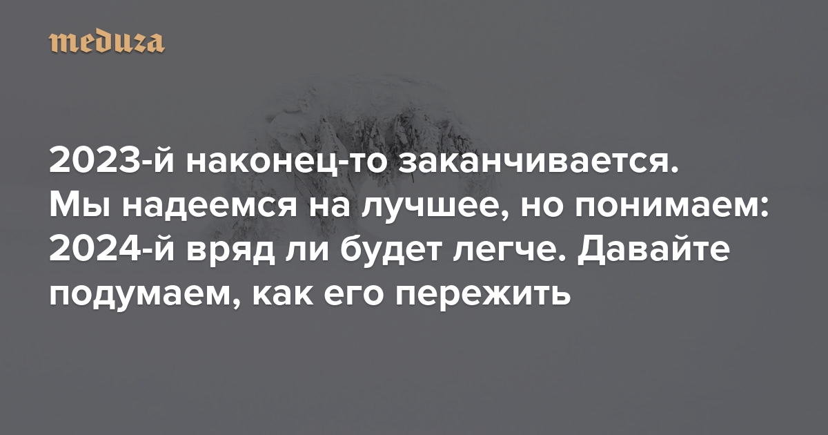 Пандемия, полный разгром оппозиции и попытка убийства Навального, провал революции в Беларуси, миллионы беженцев, война, еще война и снова война, не говоря уже о том, что мир тонет в климатическом кризисе, — вот как мы прожили последние четыре года. 2023-й оказался таким же сложным, как и предыдущие, — и вот он заканчивается. Конечно, мы надеемся на лучшее. Но не хотим обманываться: 2024-й вряд ли будет легче. Нам остается лишь беречь себя, поддерживать друг друга и не терять из виду то, что служит нам опорой. Кстати, на что опираетесь вы в эти темные времена? Может быть, то, что помогает вам, окажется полезным и для других. Расскажите об этом «Медузе» — наиболее полезные советы мы опубликуем в отдельном материале под Новый год. Вместе мы обязательно справимся.
