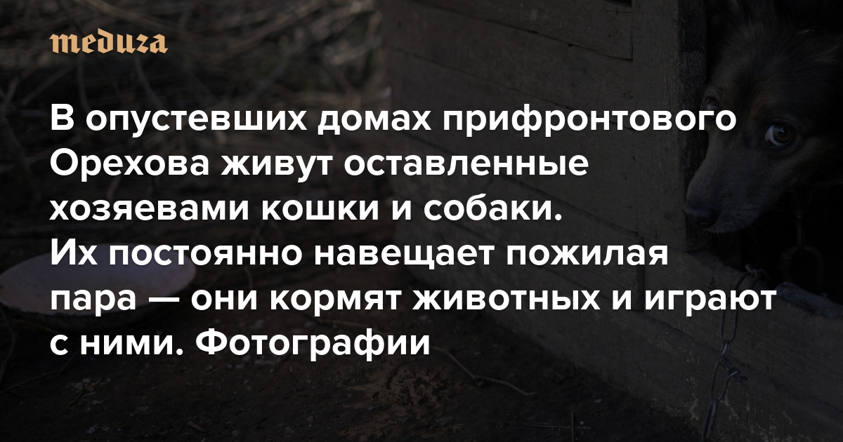 В опустевших домах прифронтового Орехова живут кошки и собаки, оставленные хозяевами. Их постоянно навещает пожилая пара — они кормят животных и играют с ними Шестьсот пятьдесят седьмой день войны. Фотографии