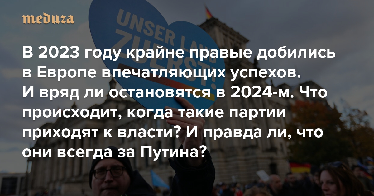 В 2023 году крайне правые добились в Европе впечатляющих успехов. И вряд ли остановятся в 2024-м Что происходит, когда такие партии приходят к власти? И правда ли, что они всегда за Путина?