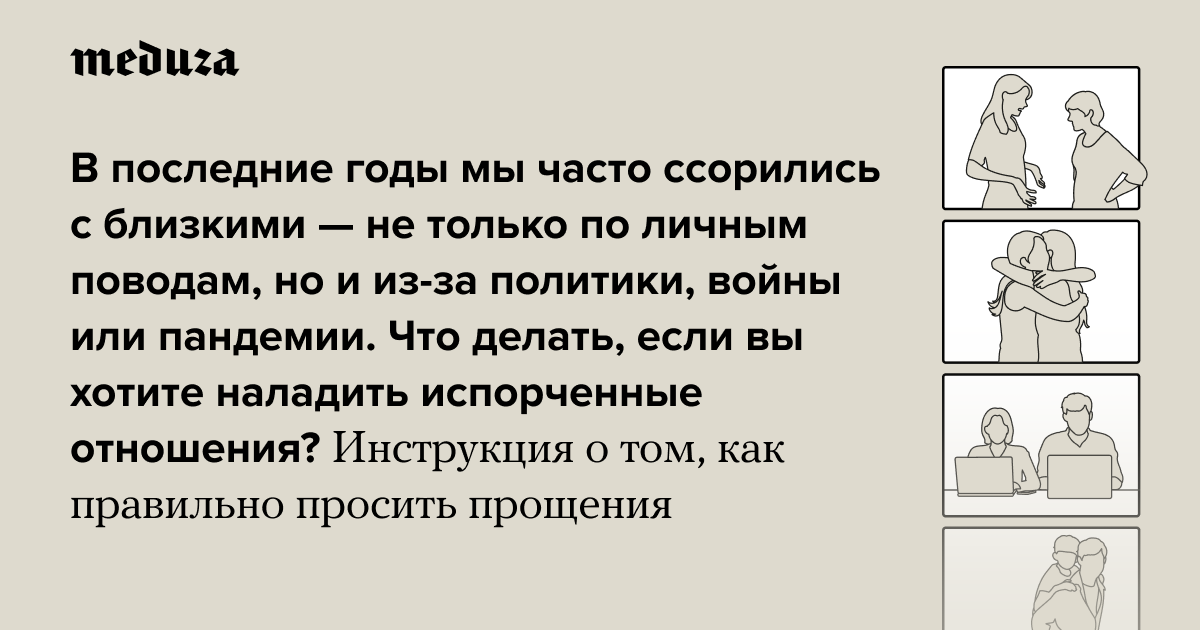 В последние годы мы часто ссорились с близкими — не только по личным поводам, но и из-за политики, войны или пандемии. Что делать, если вы хотите наладить испорченные отношения? Инструкция о том, как правильно просить прощения