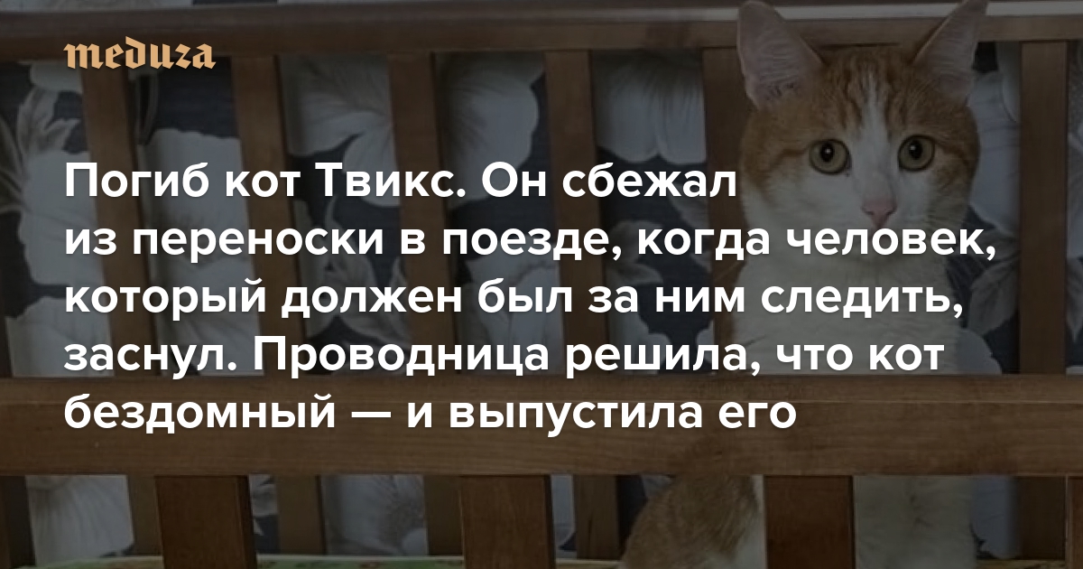 РЖД изменят правила после гибели кота Твикса Он сбежал из переноски в поезде, когда человек, который должен был за ним следить, заснул. Проводница решила, что кот бездомный, — и выпустила его на вокзале