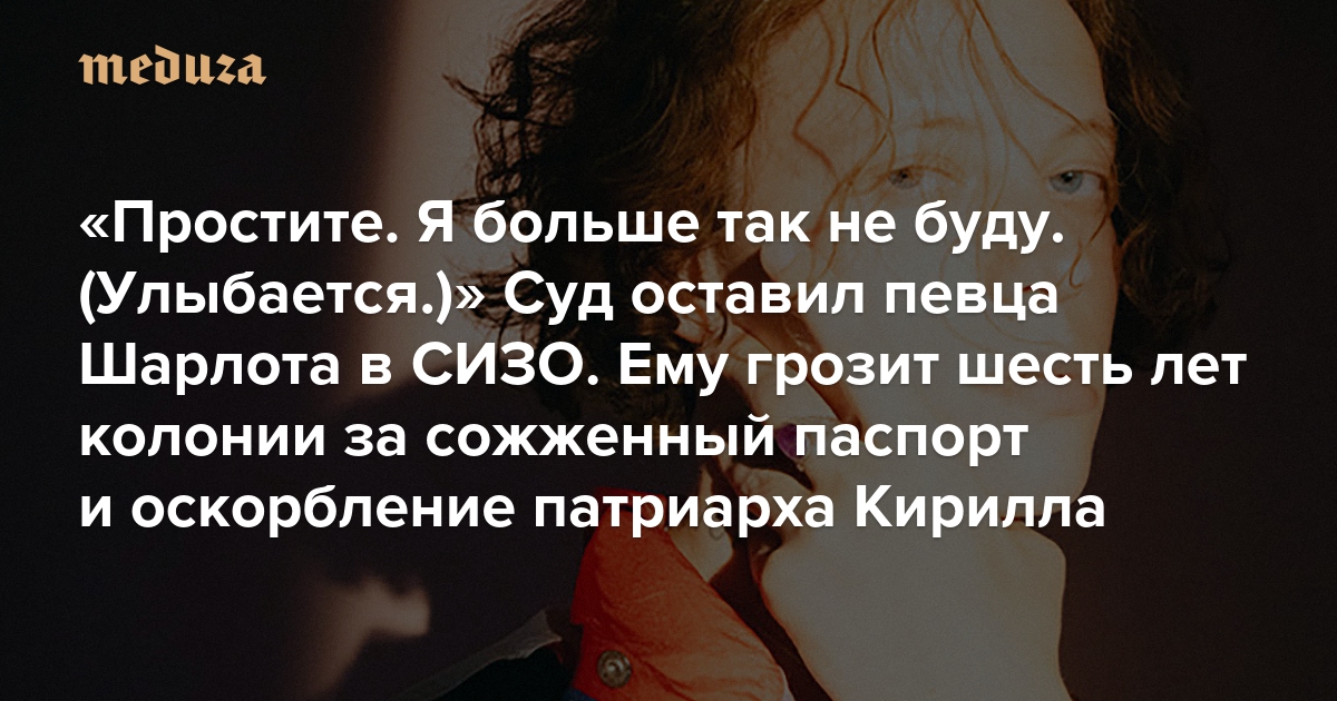 «Простите. Я больше так не буду. (Улыбается.)» Суд оставил певца Шарлота в СИЗО. Ему грозит шесть лет колонии за сожженный паспорт и оскорбление патриарха Кирилла. Вот его история