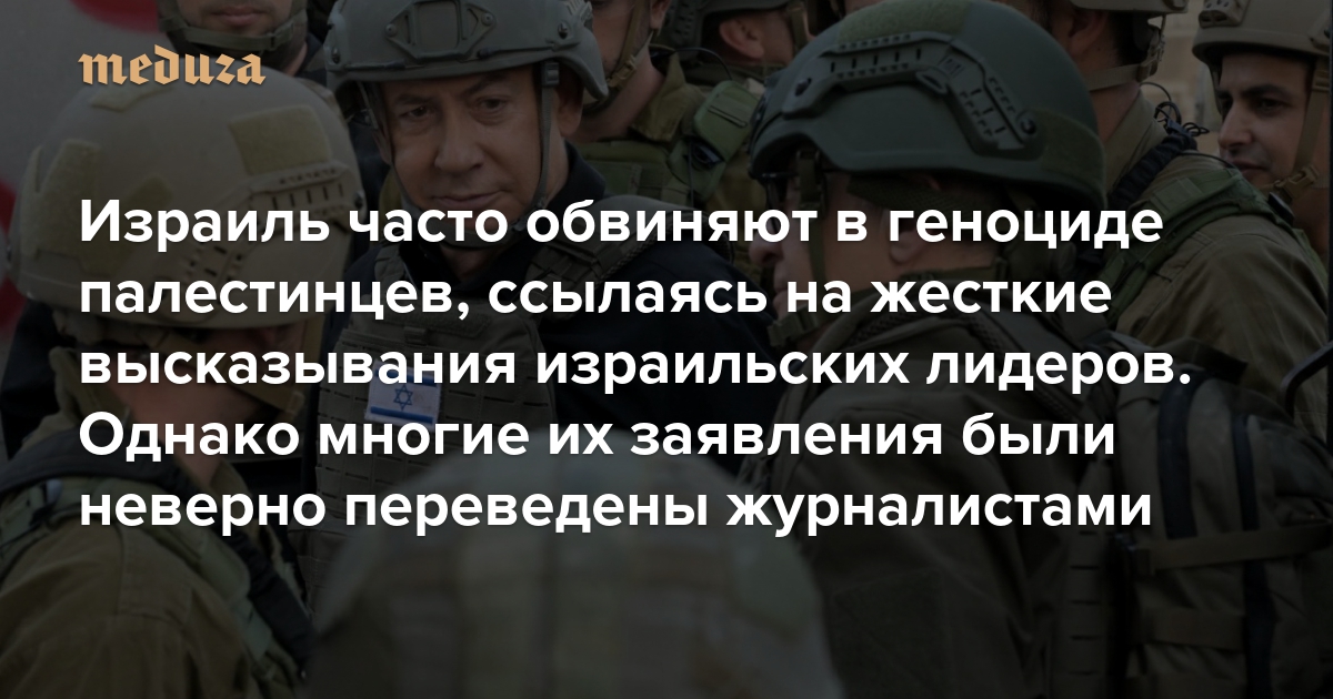Война в секторе Газа, начавшаяся после нападения ХАМАС на Израиль, продолжается больше 100 дней. В результате атаки террористической группировки погибли 1 200 человек, сотни людей оказались в заложниках у боевиков. В ответ Армия обороны Израиля нанесла удары по сектору, а затем начала наземную операцию. По данным местного Минздрава (ХАМАС контролирует это ведомство, как и другие органы власти в секторе Газа), с начала войны там погибли больше 25 тысяч человек; ООН соглашается с этими оценками. Практически с самого начала войны Израиль обвиняют в военных преступлениях. При этом действия ЦАХАЛ многие политики, правозащитники и журналисты часто называют «геноцидом» — ссылаясь, в том числе, на жесткие высказывания высокопоставленных израильских чиновников и военных. Однако, как выяснил обозреватель The Atlantic Яир Розенберг, многие из этих заявлений (включая те, что вызвали наибольшее возмущение) были неверно переведены журналистами — а затем растиражированы международными СМИ. И хотя позднее публикации были скорректированы, эти цитаты, разумеется, продолжают распространяться в интернете в искаженном виде.
