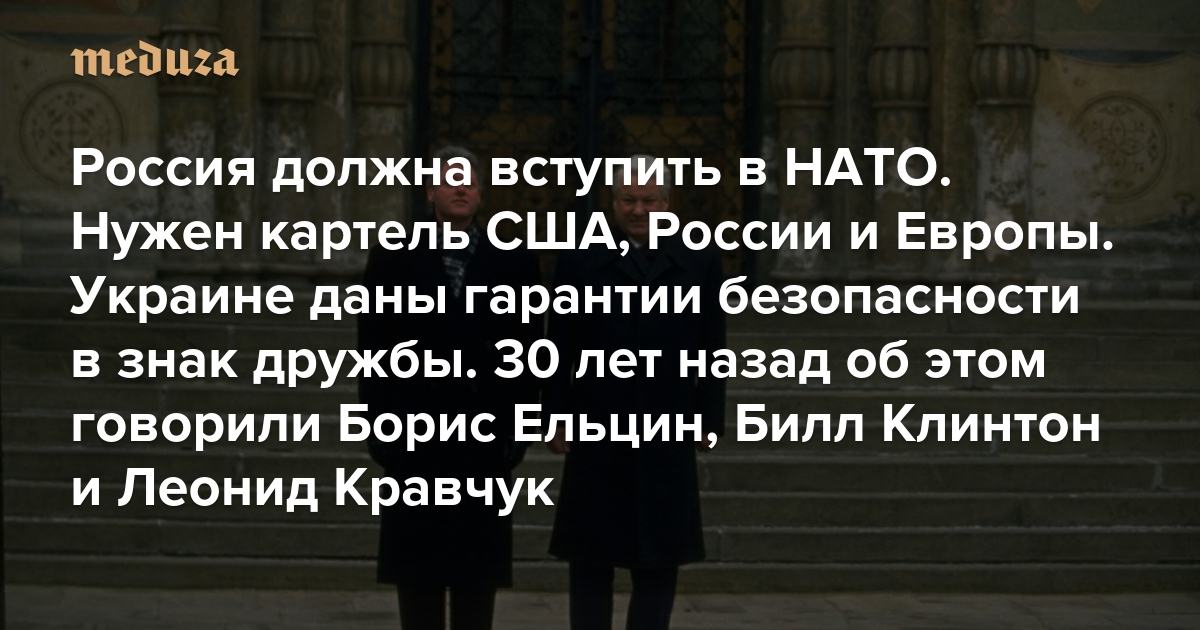 Россия должна вступить в НАТО. Нужен картель США, России и Европы. Украине даны гарантии безопасности в знак дружбы и добрососедства 30 лет назад об этом говорили Борис Ельцин, Билл Клинтон и Леонид Кравчук. Опубликованы документы об их переговорах