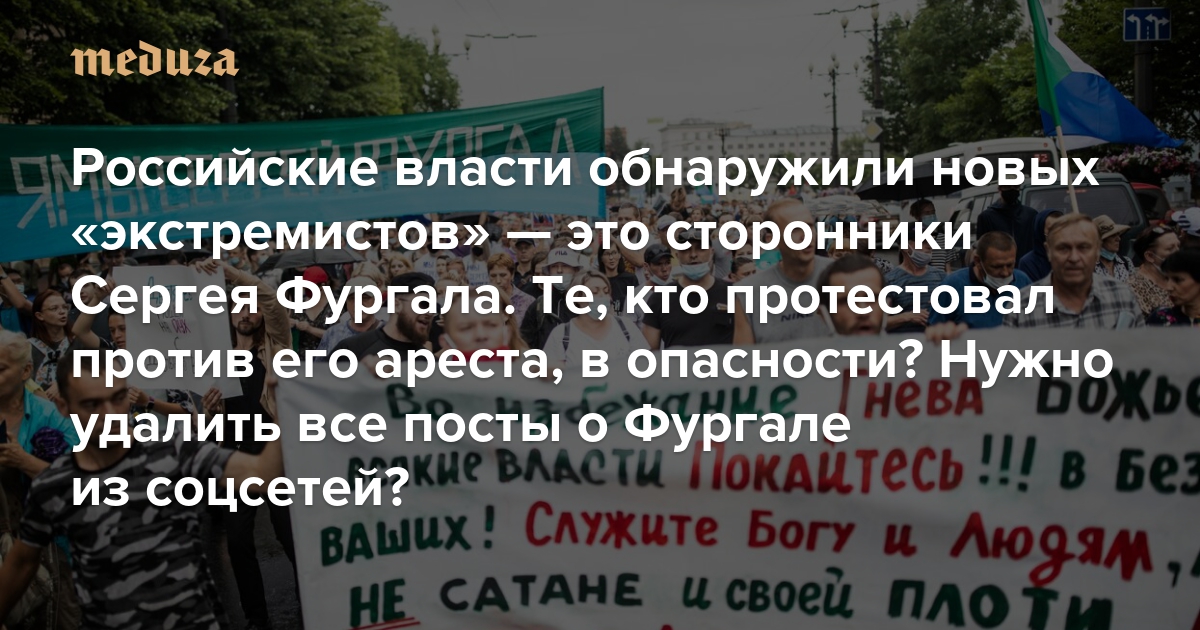 Российские власти обнаружили новых «экстремистов» — это сторонники Сергея Фургала Те, кто протестовал против ареста губернатора, в опасности? Нужно ли удалить все посты «Я/Мы Фургал» из соцсетей? Отвечаем на самые тревожные вопросы