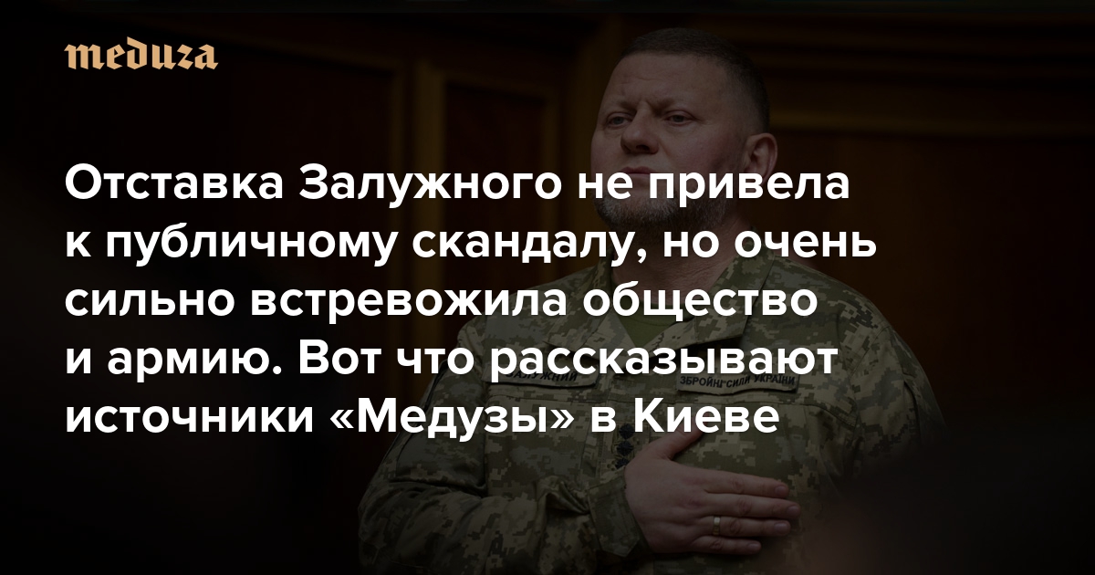 Еще один украинский источник «Медузы» в генеральском звании говорит, что многие военнослужащие просто деморализованы новостью об отставке Залужного. Сам он объясняет увольнение главкома исключительно «политической ревностью» со стороны Зеленского: «Было желание побыстрее убрать Залужного, чтобы о нем поскорее забыли. К сожалению, не борьба за страну и победу, а какая-то борьба без правил внутри страны».