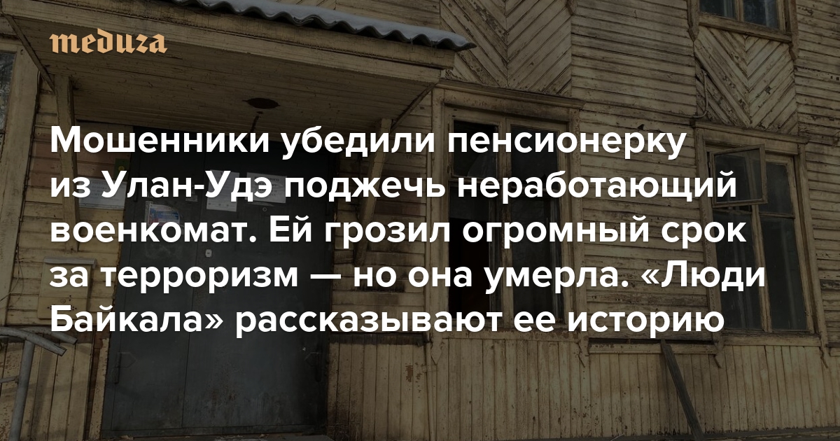 «Была за Путина. Телевизор смотрела, верила только ему» Мошенники убедили пенсионерку из Улан-Удэ поджечь неработающий военкомат. Ей грозил огромный срок за терроризм — но она умерла. «Люди Байкала» рассказывают ее историю