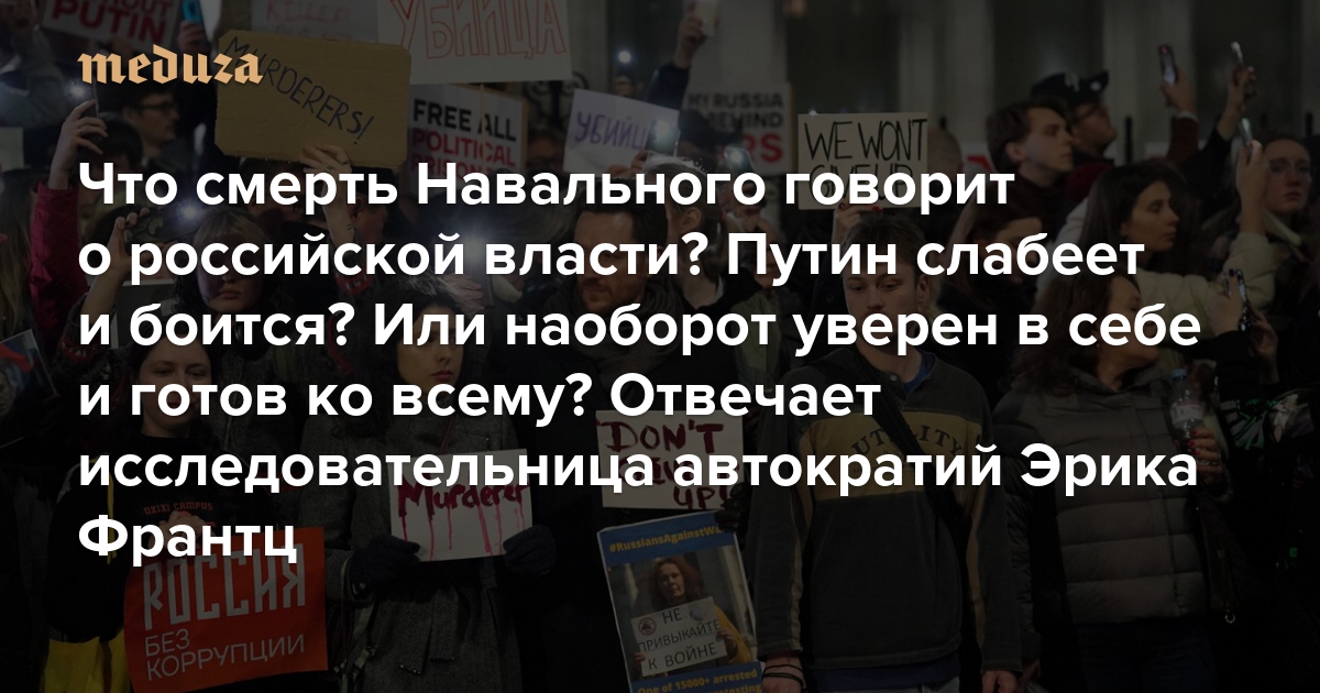 Что смерть Навального говорит о российской власти? Путин слабеет и боится? Или, наоборот, уверен в себе и готов ко всему? Отвечает исследовательница автократий Эрика Франтц