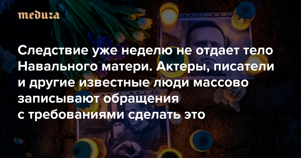 Спустя неделю после смерти Алексея Навального в колонии «Полярный волк» его семье все еще не выдают тело. Мать политика Людмила Навальная рассказала 22 февраля, что провела почти сутки в Следственном комитете Салехарда, где ей показали медицинское свидетельство о смерти, но тело сына так и не выдали («Медуза» объясняла, почему это незаконно). По словам Людмилы Навальной, следователь потребовал от нее согласиться на тайные похороны, угрожая, что в случае отказа «они что-то сделают с телом». После этого многие общественные деятели, актеры, музыканты и писатели начали записывать видео, требуя от властей отдать тело Навального его матери. Их обращения публикуют соратники политика.