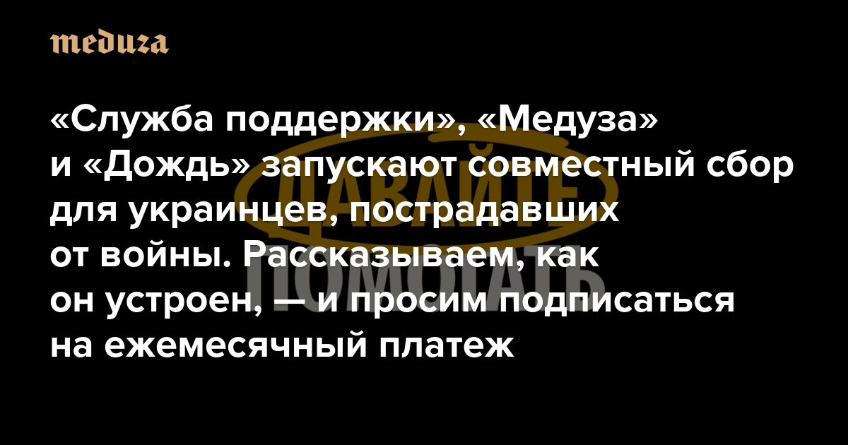 «Служба поддержки», «Медуза» и «Дождь» запускают совместный сбор для украинцев, пострадавших от войны Рассказываем, как он устроен, — и просим подписаться на ежемесячный платеж
