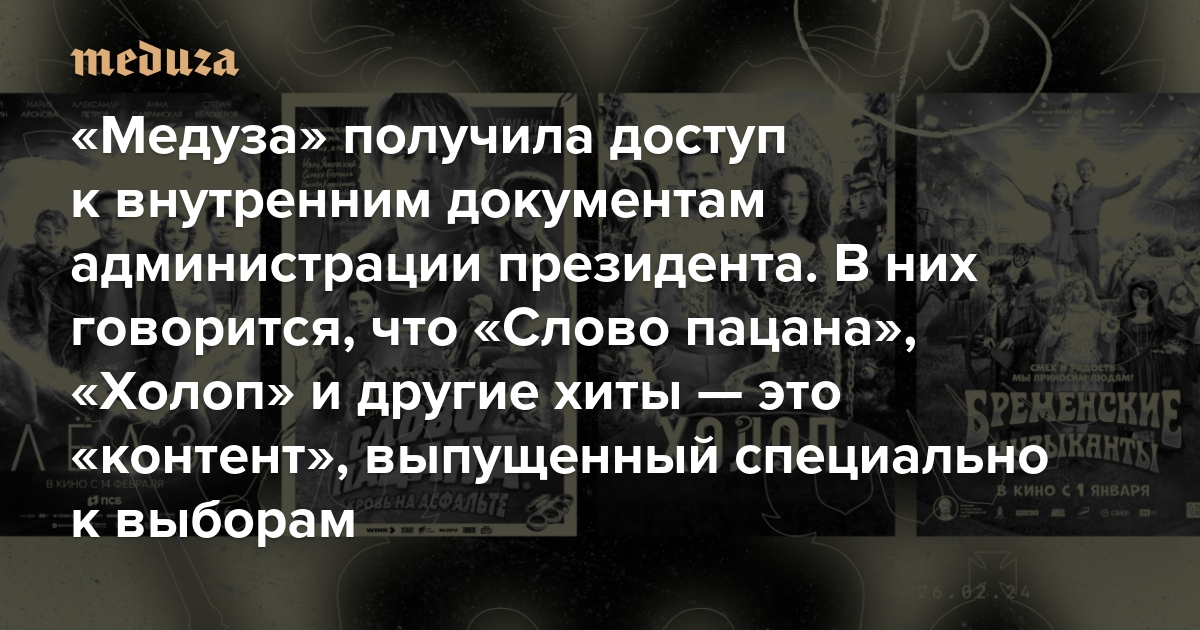 «Медуза» получила доступ к внутренним документам администрации президента РФ. В них говорится, что «Слово пацана», «Холоп» и другие хиты — это «контент», выпущенный специально к выборам Это правда?