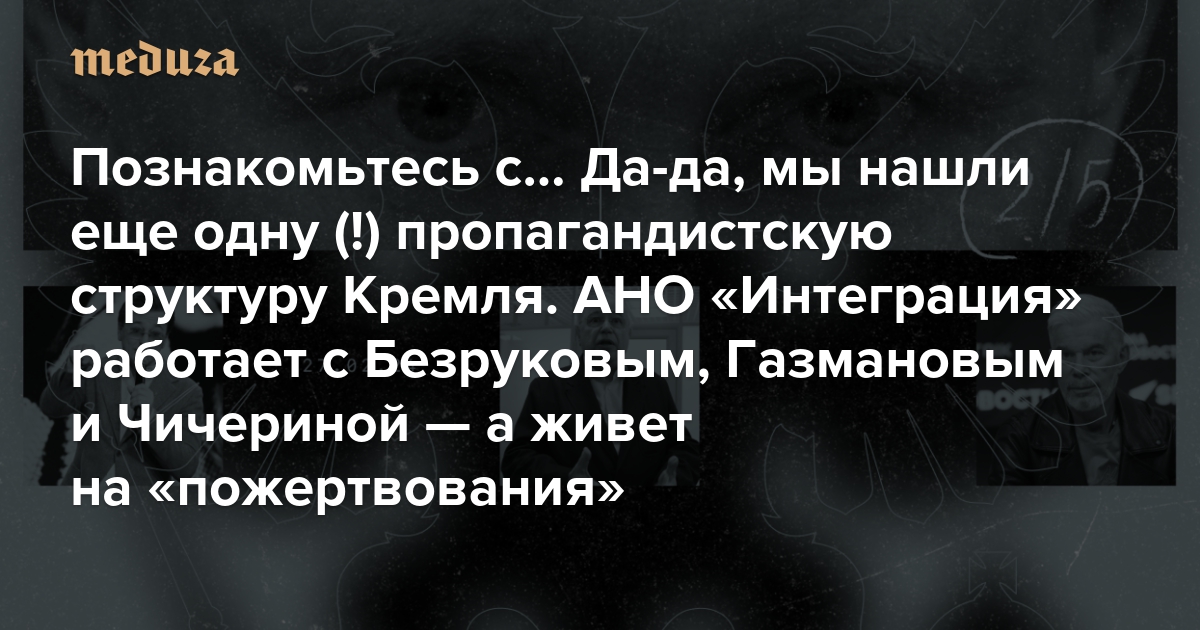 Познакомьтесь с… Да-да, мы нашли еще одну (!) пропагандистскую структуру Кремля АНО «Интеграция» работает с Безруковым, Газмановым и Чичериной — а живет на «пожертвования» от компаний, близких к государству