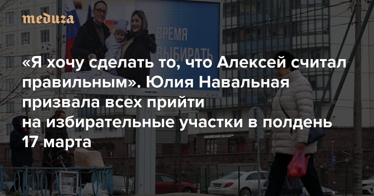 Вдова Алексея Навального Юлия Навальная выпустила обращение, в котором призвала жителей России принять участие в акции «Полдень против Путина» — и прийти на избирательные участки одновременно в 12:00 17 марта, в основной день голосования на выборах президента РФ. Эту же акцию незадолго до своей смерти поддержал Алексей Навальный. После его смерти соратники политика назвали участие в акции «политическим завещанием Алексея Навального».