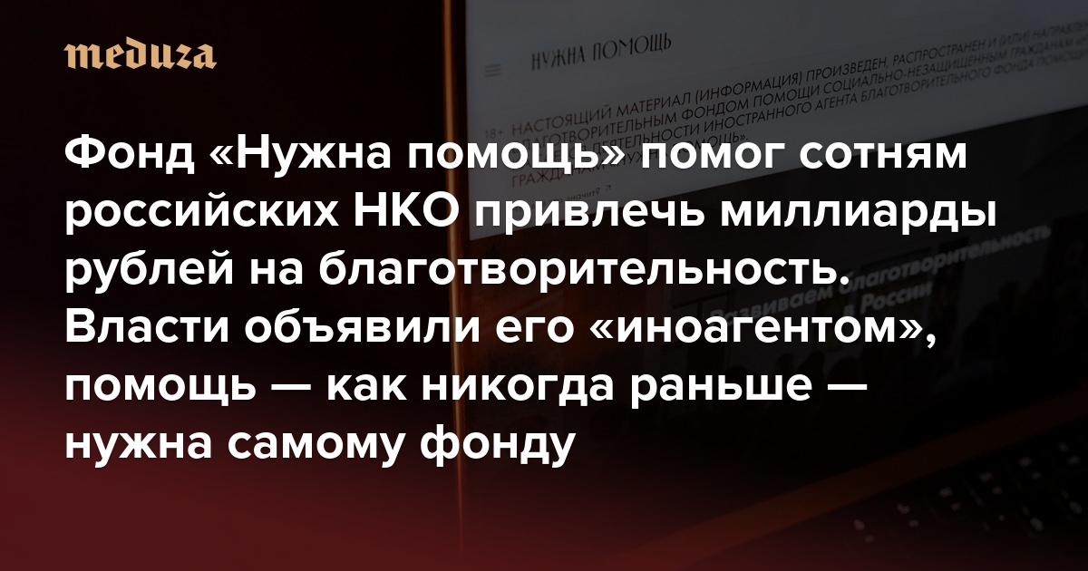 Фонд «Нужна помощь» помог сотням российских НКО привлечь миллиарды рублей на благотворительность. Власти объявили его «иноагентом» Из-за дискриминирующего статуса помощь — как никогда раньше — нужна самому фонду