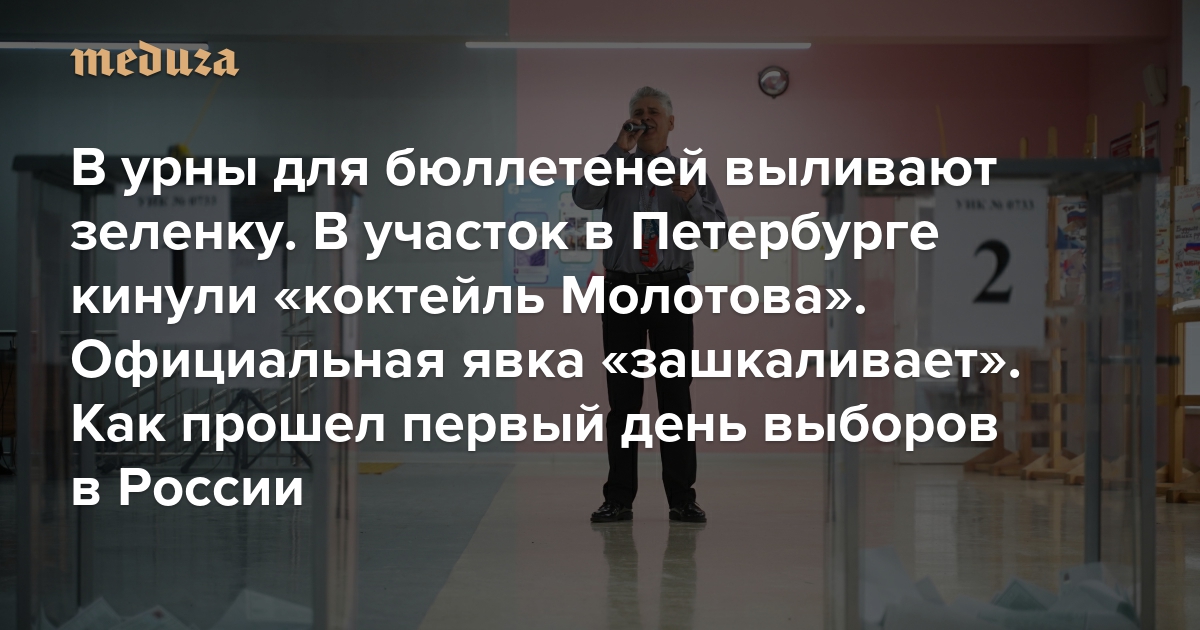 В урны для бюллетеней выливают зеленку. В участок в Петербурге кинули «коктейль Молотова». Официальная явка «зашкаливает» Как прошел первый день выборов в России