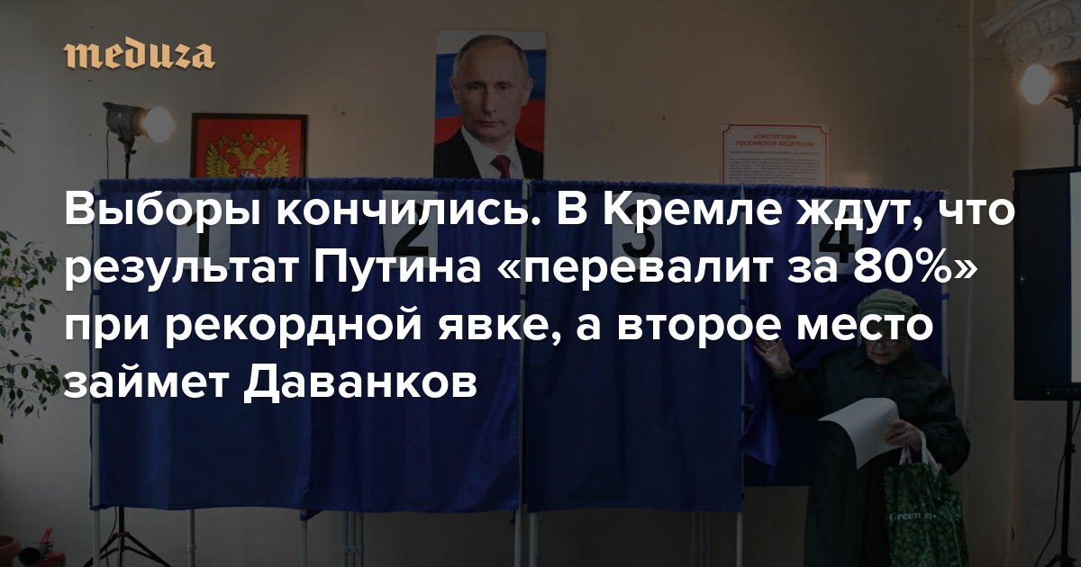 В политическом блоке администрации президента (АП) РФ «довольны» ходом и результатами президентских выборов, утверждают два источника «Медузы», близких к Кремлю, а также собеседник в руководстве «Единой России». По их оценкам, чиновникам удастся перевыполнить поставленный перед выборами KPI — как ранее писала «Медуза», в АП изначально планировали, что Путин наберет не меньше 80% при явке 70–80%; именно на такие показатели Кремль ориентировал региональные администрации по всей России.
